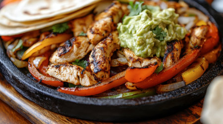 A sizzling fajita platter with grilled chicken, peppers, and onions, served with warm tortillas and guacamole.