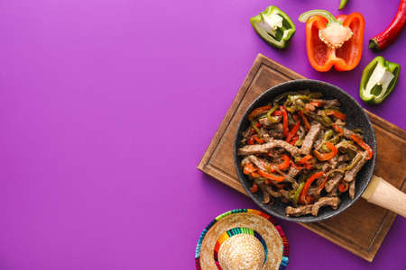 Frying pan with tasty beef Fajita and sombrero hat on purple background