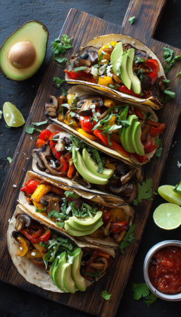 Vegan bbq tacos filled with grilled mushrooms, peppers, and fresh avocado slices, styled on a wooden board. the vibrant colors and fresh ingredients highlight a modern and healthy culinary approach, ideal for a summer gathering or party.