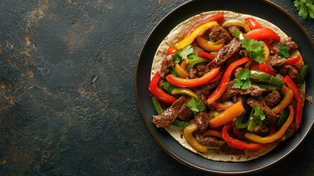 A plate of spicy beef fajitas with saut peppers and onions, top view, with space for copy.