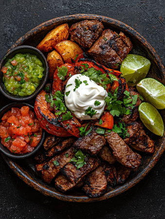 A visually appealing assortment of grilled meats featuring chicken and beef, accompanied by vibrant vegetables, fresh salsas, and warm tortillas.