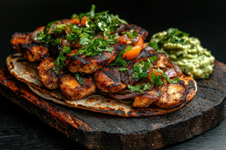 A gourmet Mexican meal with grilled steak, fresh vegetables, and guacamole generated by artificial intelligence