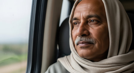 Elderly hispanic male gazing out train window reflecting peaceful journey