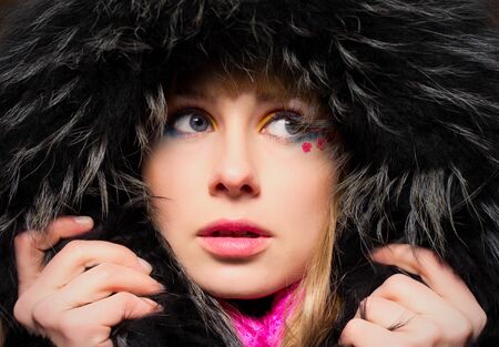 Closeup portrait of young woman in fur hood