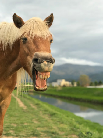 Laughing horse on the bank of a small river with background of a cloudy sky