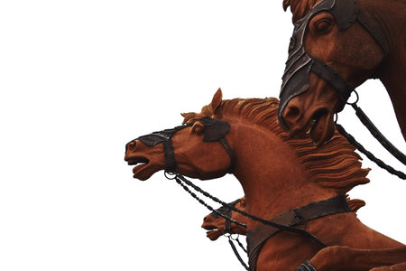 Two horses looking down. White background. Empty space between. Equestrian theme.