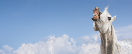 white horse smiling on sky background, banner for website