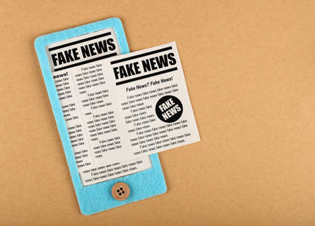 Close up felt craft blue smartphone with FAKE NEWS newspapers feed from screen over brown paper background, elevated top view, directly above