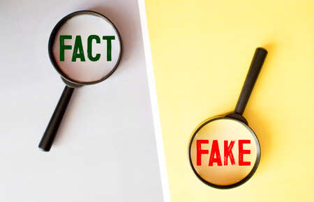 A magnifying glass looking to the words fact fake made with letter game blocks on a bright yellow background. Conceptual image of distinguish facts from fake news.