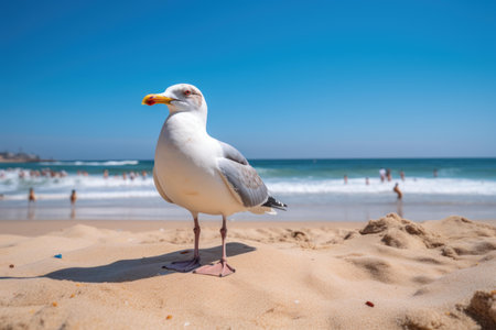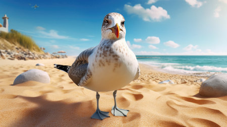 Seagull standing on sandy beach with ocean waves and blue sky in background. That the image is generated using AI.