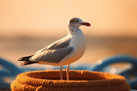Seagull sitting on a pile of fishing nets on the beach