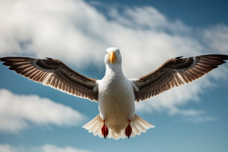Seagull flying in the blue sky with white clouds, close up