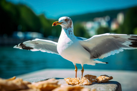 Seagull pecks the food left on the ground. Ai generated.