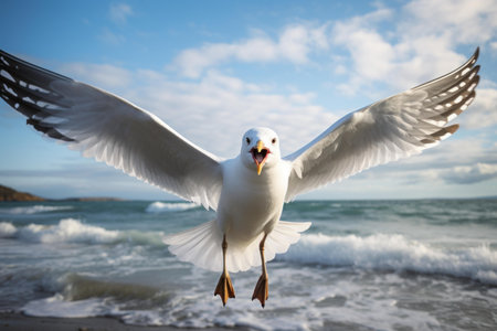 Majestic seagull with wings spread wide glides over a scenic beach background