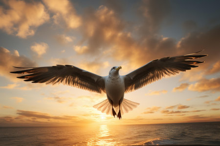 Seagull with spread wings soars against a stunning sunset over the ocean