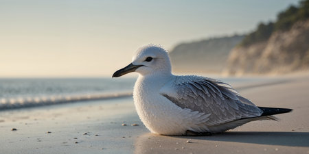 AI Generated. Wet seabird resting on the sandy shore during a serene morning along the coastline