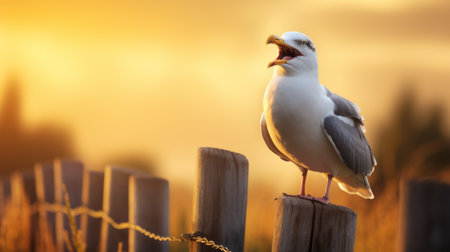 a seagull perched on a fence post, overlooking a vibrant cornfield on a farm. the seagull appears content and radiates joy, creating a warm and inviting atmosphere in this beautifully captured photograph. ai generated