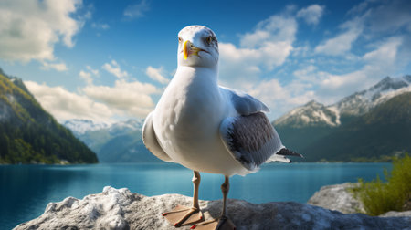 a seagull perched on rocks by the water, with majestic mountains in the background. this hyper-realistic representation captures the whimsical gag-humor of the scene. the photo, created in the style of daz3d and the vancouver school, showcases the stunning beauty of nature. a high-quality, low-angle shot reminiscent of national geographic's captivating photography. ai generated