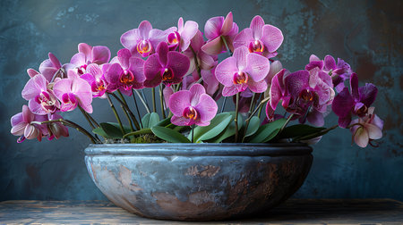 A stunning arrangement of vibrant pink orchids in a rustic, textured pot set against a dark, moody background. Perfect for home decor, floral design, and nature photography.