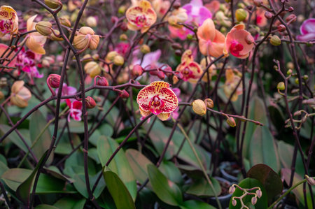 Cultivation of colorful tropical flowering plants orchid family Orchidaceae in Dutch greenhouse with UV IR Grow Light for trade and worldwide export, blossom