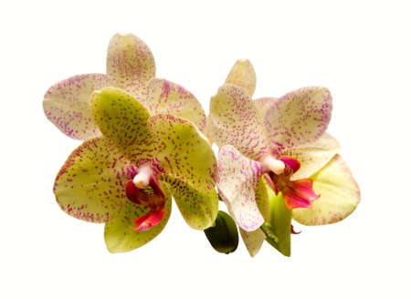 Yellow with red spots orchid close up branch flowers, isolated on white background.