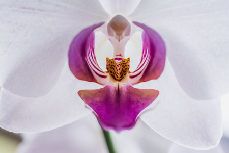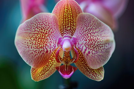 Close-up of a blooming orchid with intricate patterns and vivid colors, highlighting its exotic beauty and elegant structure.