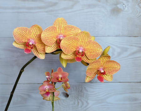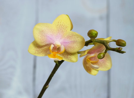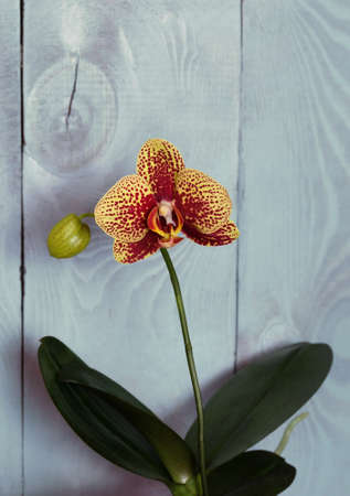 Yellow phalaenopsis orchid with burgundy spots, variety Charmer on a blue wooden background, selective focus, vertical orientation.