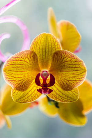 close-up of a blossoming heads of yellow with red lines orchid flowers (ophalaenopsis)