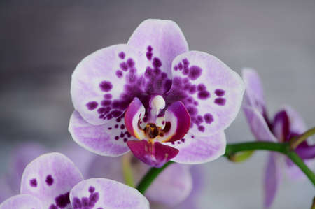 violet butterfly orchid with dots, macro photo in front of a gray background