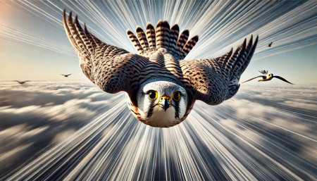A stunning close-up shot of a falcon soaring through the sky, showcasing its powerful wings and piercing eyes, epitomizing grace and majesty in the wild.