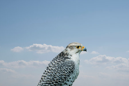 Portrait of a white falcon or gyrfalcon, bird of prey before blue sky