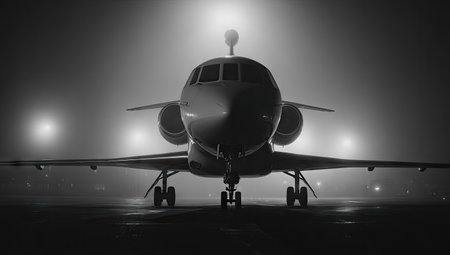 A grayscale image displays a private jet centered on an airport runway at night. The aircraft is illuminated by surrounding lights. The composition features a symmetrical arrangement, with a focus on the plane's sleek design. Suitable for various commercial uses.
