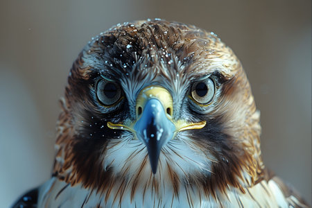 Stunning close-up of a hawk showcasing its intricate plumage details and piercing eyes. snowflakes on the bird add a touch of winter beauty, making this an ideal image for nature-themed prints, posters, and greeting cards. Generative AI