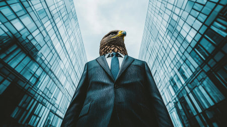 A hawk-headed business figure in a suit standing in front of a futuristic office building, exuding confidence and power.
