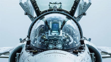 A detailed view of the cockpit of an airplane, showing the controls and instruments used by the pilot, Close-up view of a fighter aircraft cockpit, AI Generated