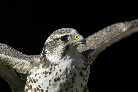 Saker falcon (Falco cherrug) with wings outstretched preparing for flight. Here isolated against a black background allowing for copy space. Ideal falconry bird of prey poster image.