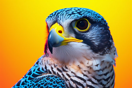 A striking close-up of a falcon, showcasing its intricate details and vibrant colors. This image captures the essence of wildlife and natural beauty.