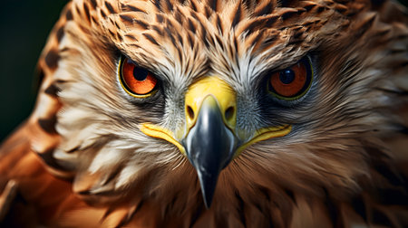 Intense close-up of an eagle's eye showcasing vivid orange and black colors, intricate feather detail, and sharp beak against a dark backdrop. ideal for wildlife conservation projects, nature photography exhibitions, and educational purposes. Generative AI