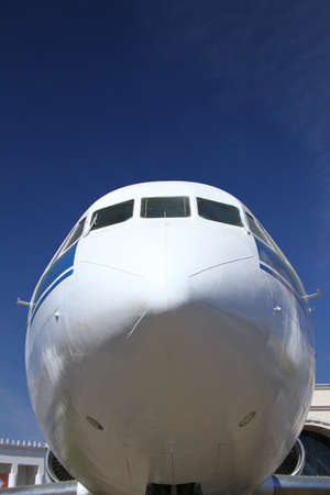Jet airplane parked on airport. Front view plane