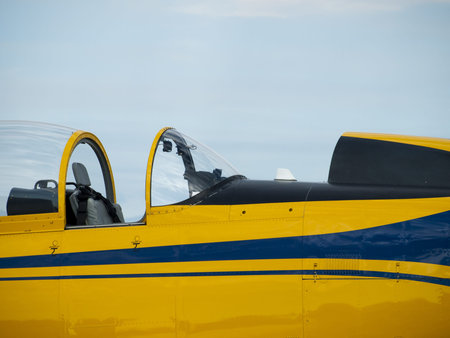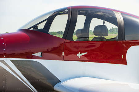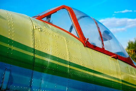 Cokpit detail of colorful airplane on the grass of the airfield