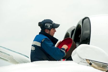 Tyumen, Russia - June 19, 2019: Aircraft repair helicopter UTair Engineering plant. Male mechanic in uniform examining helicopter. Pre flight inspection at the airport