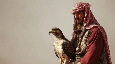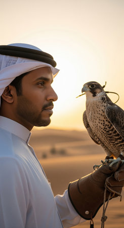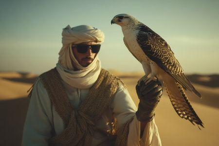 Falconer with sunglasses and keffiyeh holding a falcon perched on his gloved hand in a desert landscape