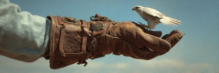 Young falcon training for falconry sits perched on the trainer\'s gloved hand