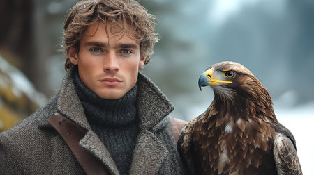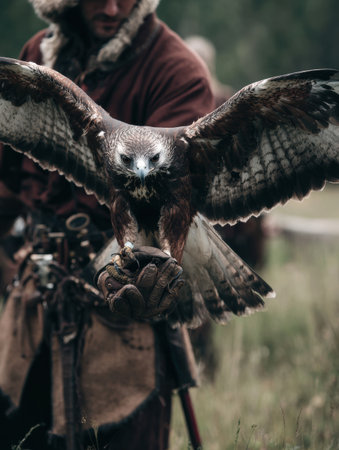 A skilled hunter in traditional attire holds a falcon in a misty dawn forest, capturing a moment of focus and connection.