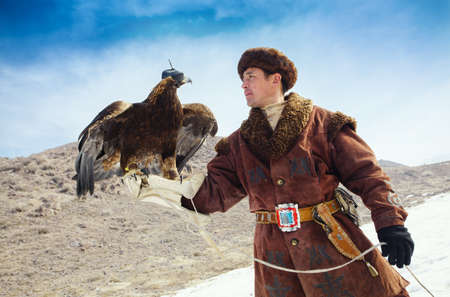 SAGSAY, MONGOLIA - SEP 28, 2017: Eagle Hunter traditional clothing, while hunting to the hare holding a golden eagle on his arm in desert mountain of Western Mongolia.