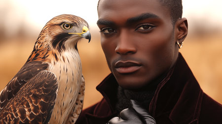 A skilled falconer showcases the bond between human and bird of prey, illuminated by golden sunset light. Generative AI