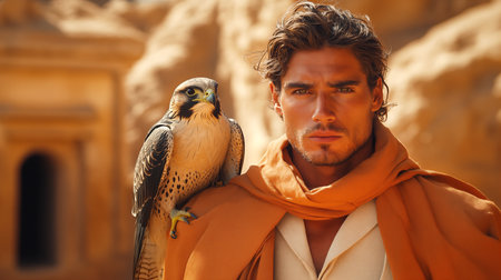 Contemplative Egyptian falconer stands in the desert with majestic bird of prey.