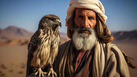 A traditional falconer poses proudly with his majestic eagle, showcasing the deep bond between man and bird in a serene desert landscape.