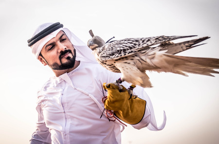 Arabic man with traditional emirates clothes walking in the desert with his falcon bird