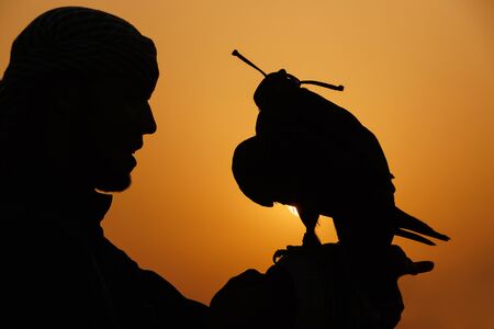 Young arab man in traditional white kandura is holding a majestic falcon on his glove, practicing falconry in the desert at sunset.